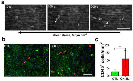 Microfluidic experiments indicate that CHI3L1 is able to promote adhesion of immune cells to endothelial cells. (a) HUVECs were perfused for 30 min with whole hirudin blood at a shear stress of 5 dyn cm−2. Shown are snapshots taken during the experiments by reflection interference contrast microscopy at indicated time points (10 s, 100 s and 200 s). The corresponding video is shown in Video S1. The black arrow indicates the flow direction. White arrows indicate leukocytes recruited from the flowing blood. Scale bar = 50 µm (b) Representative immune fluorescence images of the HUVEC layers after the flow experiment. HUVECs were stimulated with BLM cell supernatants, harvested from BLM cells either treated with 400 ng/mL CHI3L1 or PBS (CTL). CD31 was used as an endothelial cell marker (green); CD45 was used as an immune cell marker (red). Nuclei were stained with 4′,6-diamidino-2-phenylindole (DAPI, blue). Scale bar = 100 µm (c) Quantitative evaluation of immune cell adhesion. n = 5; * = p ≤ 0.05 Student’s t-test.