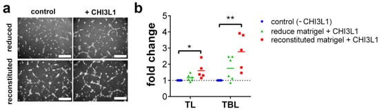 CHI3L1 liberated proangiogenic factors from matrigels promoted tube formation by HUVEC. (a) Representative images of HUVEC seeded on growth factor reduced or FCS reconstituted matrigel. HUVEC were either treated with PBS (control) or 400 ng/mL CHI3L1. (b) Automatized analysis of the total tube length (TL) and the total branching length (TBL). Data were normalized to the corresponding control experiment. n = 5; * p ≤ 0.05, ** p ≤ 0.01 one-way ANOVA.
