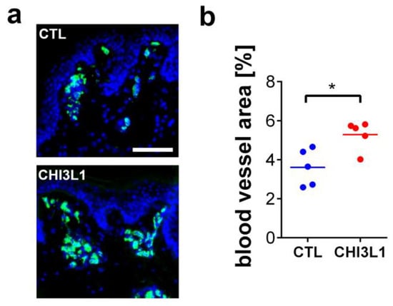 To further support these data, we investigated the impact of CHI3L1 on neoangiogenesis in ex vivo skin samples. Punch biopsies of porcine skin were cultivated in an air-liquid interface configuration in which the dermis is placed in a culture medium, while the epidermis is exposed to the air []. After two days of cultivation, we quantified the number and size of dermal blood vessels by immunofluorescence detection of the blood vessel marker von Willebrand factor (Figure 8a). To analyze the impact of CHI3L1 on blood vessel formation, we added 400 ng/mL recombinant CHI3L1 into the culture medium. After treatment of the skin samples with CHI3L1, the area covered by blood vessels increased significantly in comparison to the vehicle-treated skin samples (Figure 8b).