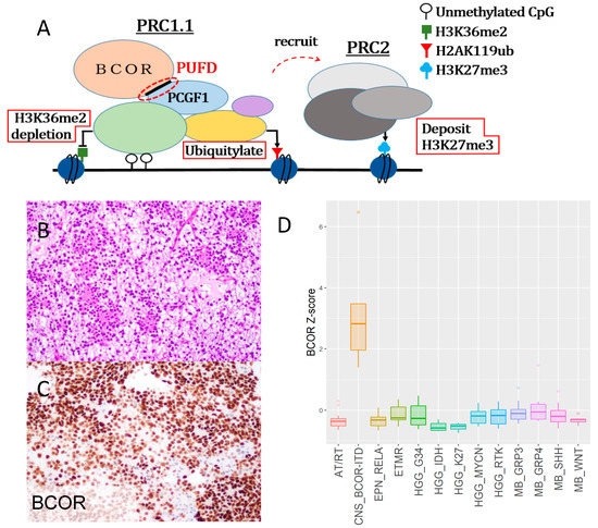 In a study comparing gene expression in clear cell sarcoma of the kidney (CCSK) harboring BCOR-ITD to Wilms tumors, upregulation of PRC2 targets were described, suggesting disruption of polycomb regulation as a possible pathogenic mechanism [18]. However, PRC upregulation was not highlighted in the original study of CNS tumors with BCOR alterations when they compared expression within four newly described tumor entities [1].