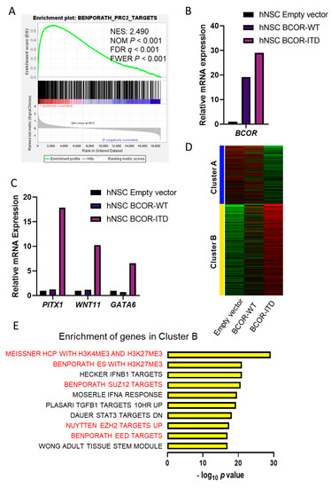 BCOR-ITD is associated with upregulation of PRC2 targets in primary tumors and neural stem cells. (A) GSEA of CNS-BCOR ITD primary tumors revealed significant upregulation of PRC2 targets. (B) Increased expression of BCOR mRNA in BCOR-WT and BCOR-ITD hNSC models. (C) Increased mRNA expression of PRC2-target genes PITX1, WNT11, and GATA6 in hNSC with BCOR-ITD determined by RTqPCR. (D) K-means clustering identified two clusters of differentially expressed genes between hNSC with empty vector, BCOR-WT, and BCOR-ITD. (E) Top 10 gene sets from MsigDB c2 enriched in Cluster B, with PRC2 or H3K27me3 related gene sets highlighted in red.