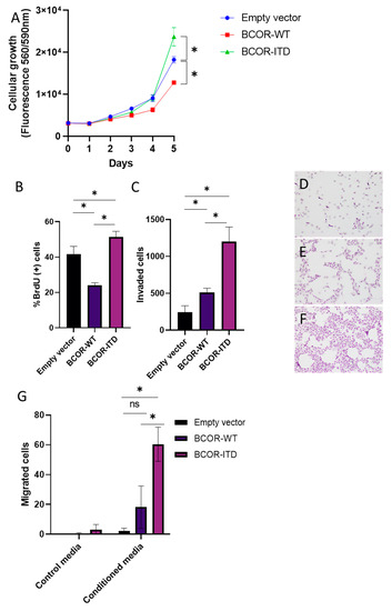 2.4. BCORE7–15-ITD Overexpression Increased Cellular Growth, Invasion, and Migration of mNSC, while BCORE7–15-WT Decreased Cellular Growth