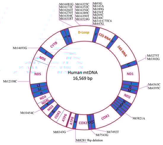 Simplified map of the human mitochondrial genome. The mtDNA mutations associated with PCOS, listed in Table 1, are marked.