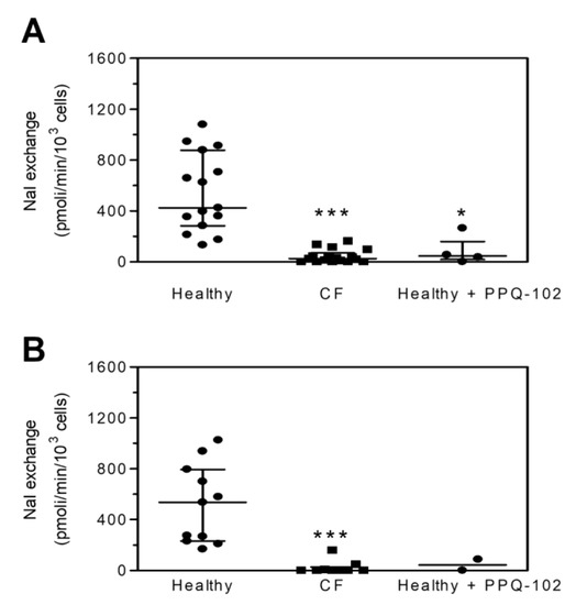 As indicated in Figure 1A, the median value of NaI exchange, obtained following the CFTR stimulation of healthy PBMCs, is significantly different from that obtained after the CFTR stimulation of CF PBMCs or healthy PBMCs treated with PPQ-102, a specific CFTR inhibitor. The data distribution suggests that the assay is capable of discriminating PBMCs from CF and healthy donors. Similar results were obtained with monocytes (Figure 1B), suggesting that our experimental approach could be used also with these cells.