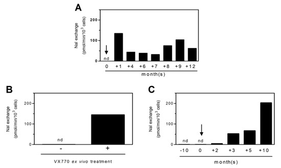 In support of the hypothesis that the HS-YFP test on PBMCs or monocytes from CF patients could be useful in evaluating treatment efficacy, we monitored CFTR activity before and during Ivacaftor therapy in a patient carrying CFTR G1349D and F508del mutations. The NaI exchange values recorded at different times are reported in Figure 2A. Before starting the therapy, PBMCs did not show any CFTR activity (nd), but after one month of treatment, the NaI exchange values significantly increased, remaining appreciable for all intervals of monitoring.