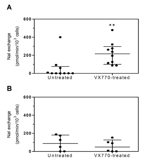CFTR activity in PBMCs following ex vivo cell treatment with VX770. CFTR activity was measured in PBMCs isolated from CF patients (n = 16) and exposed for 24 h to either vehicle (untreated) or 5 µM VX770 (VX770-treated). (A) Responsive CF patients’ PBMCs (n = 10). (B) Unresponsive CF patients’ PBMCs (n = 6). Data are expressed as the median with interquartile range. Statistical analysis was carried by means of the Wilcoxon signed rank test. ** p < 0.01.