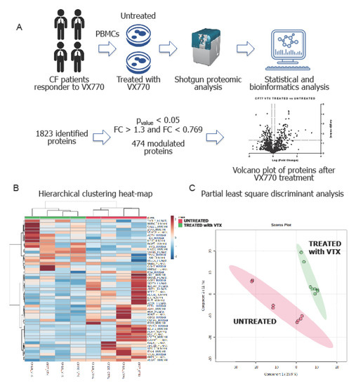 Shotgun proteomics of PBMCs treated with VX770 and untreated. (A) Modulated proteins were then elaborated with bioinformatics to identify biological mechanisms associated to CFTR restoration. A representative Volcano plot of four is shown. Each Volcano plot is in Supplementary Materials (Supplementary Materials Figure S1); (B) Clustering heat-map and (C) partial least square discriminant analysis (PLS-DA) of PBMCs treated with VX770 (green) and untreated (red). The heat-map was created using average proteomic values for each analyzed sample, while for the PLS-DA, technical replicates were also used.