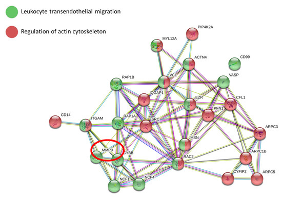 STRING network analysis of downregulated proteins in monocytes treated with VX770: the drug strongly altered leukocyte transendothelial migration and actin cytoskeleton function.