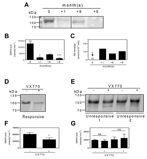 MMP9 levels in PBMCs following in vivo and ex vivo VX770 treatment: (A) PBMCs from CF patient carrying CFTR G1349D and F508del mutations were collected during the indicated months from the beginning of the Ivacaftor oral therapy. An aliquot of the cells was submitted to Western blot analysis for MMP9. MW protein markers (kDa) are reported. (B) The immunoreactive signals were quantified as specified in Methods and the data are the means ± SD from five quantifications. Statistical analysis was carried by means of a Kruskal–Wallis test followed by Dunn’s multiple comparison test. *** p < 0.001; * p < 0.05. (C) Selected CFTR activity values from those reported in Figure 2 for comparison to the MMP9 levels. (D) and (E) PBMCs from one responsive and two unresponsive CF patients to ex vivo VX770 treatment were submitted to Western blot for MMP9. MW protein markers (kDa) are reported. (F) The immunoreactive signals were quantified as specified in Methods and the data are the means ± SD from six quantifications. Statistical analysis was carried by means of Wilcoxon signed rank test. * p < 0.05. (G) The immunoreactive signals were quantified as specified in Methods and the data are the means ± SD from six quantifications. Statistical analysis was carried by means of Wilcoxon signed rank test. ns, not statistically significant.