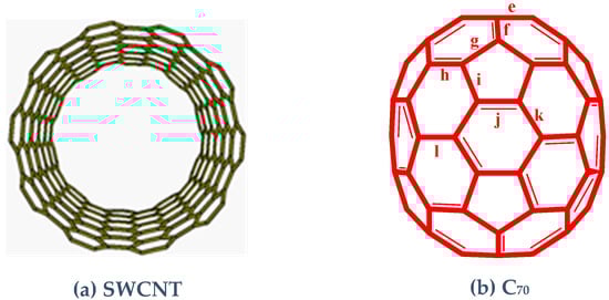 In this study, hybrid density functional theory, using Becke’s three-parameter hybrid method combined with Lee-Yang-Parr exchange-correlation functional theory (B3LYP) [,,,,,], was applied to optimize the geometries of the C60 molecule, as shown in Figure 1b. It also used the electron basis set 6–31G (d, p) []. We used the Gaussian 2003 B.04 package suite [] to fully optimize the geometry of C70, by applying the convergence criterion with tight optimization and an ultrafine pruned (99,590) grid.
