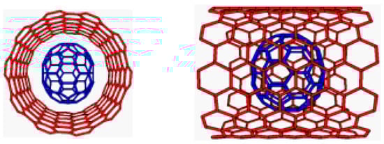 The well-known C60 molecule is highly (almost spherically) symmetric. Therefore, a C60 molecule encapsulated in a CNT remains particularly mobile, both orientationally and translationally, until low temperatures, as predicted from theory [] and confirmed by experiments []. In addition, when using tight-binding molecular dynamics, the decomposition process for C60@SWCNT [] and (C60)2@SWCNT [] was studied in which the decomposition process was at 1000 K intervals in the temperature range of 4000 to 6000 K. Using the internal space of the SWCNT as a nanometer-scale reaction chamber, double-walled carbon nanotubes (DWCNTs) forming secondary tubes inside the SWCNT were observed, which confirmed that the temperature excitation can be used to overcome the activation barrier for the inner tube formation []. The C60 molecules inside the SWCNT can remain unchanged at up to 800 °C without de-doping. Further heating to about 1200 °C induces cohesion between the C60 molecules, resulting in the molecules forming tubular structures. The annealing binding can potentially produce double-wall carbon nanotubes in a macroscopic amount. The interest in studying this material with macroscopic spectroscopy has been gathered by showing that Raman spectroscopy can be performed on DWCNTs []. Using equilibrium molecular dynamics simulations, the thermal conductivity of CNPs was described as the interaction between the nanotubes and the encapsulated fullerene particles, and the possible margin of movement between the fullerene particles. It was shown to decrease with the coalescence of encapsulated fullerene molecules [].