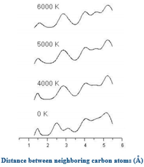 Figure 3 shows the distance distribution function of adjacent carbon atoms in a CNP structure consisting of carbon nanotubes with C70 fullerenes inserted, at temperatures of 0, 4000, 5000, and 6000 K, respectively.