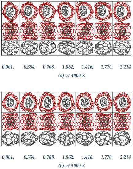 It was claimed that the conversion of C70@SWCNT into double-walled carbon nanotubes was more efficient than the corresponding conversion of C60@SWCNT due to the higher sensitivity to photolysis of the former []. Thus, it is interesting to see the snapshots of fragmentation of C70@SWCNT to understand the formation of double-walled carbon nanotubes grown by thermal treatment of peapods (the thermal annealing). We have a lot of interest in cases where molecules are inserted inside of carbon nanotubes, and it would be very interesting and important to know how C70 molecules behave in these nanotube structures.