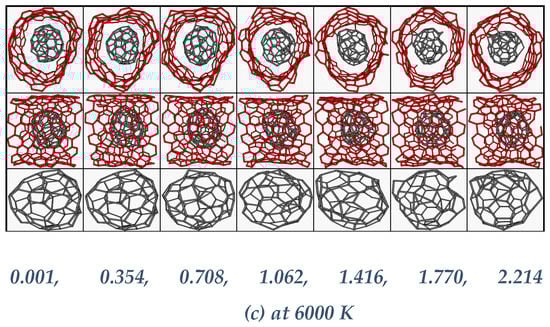 In addition, by using the snapshots in Figure 4a–c, it could be shown that we could obtain a successful formation yield of higher DWCNTs at C70@SWCNTs than C60@SWCNTs in Reference []. In previously reported experimental studies, a yield of DWCNT at C70@SWCNT is higher than C60@SWCNT due to the higher sensitivity to photolysis of the former. Thus, C70@SWCNT is more sensitive to both thermal and photolysis reactions than C60@SWCNT. The passage of thermal conductivity in the CNP was mostly transmitted through C70 rather than CNT, which was consistently the finding of a previous study [].