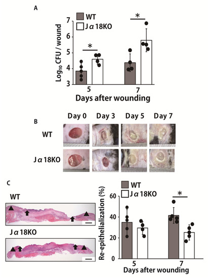 Against this background, in the present study, we analyzed the effects of iNKT cell deficiency on the healing process in P. aeruginosa–inoculated skin wounds using Jα18 knockout (KO) mice genetically lacking iNKT cells.