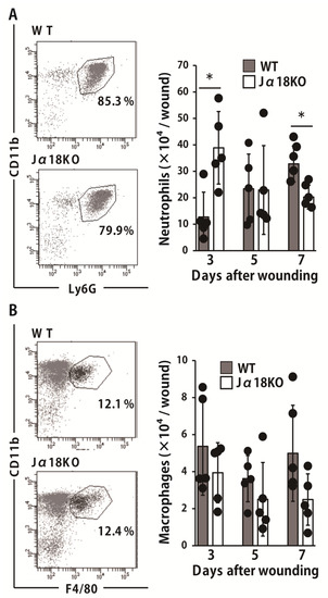 Neutrophils are innate immune cells that accumulate in the early phase of the wound healing process and play an important role in the eradication of bacteria. To elucidate the role of iNKT cells in the neutrophil-mediated host defense against this bacterium, we evaluated the number of migrated neutrophils in the wounded tissues. As shown in Figure 2A, the neutrophil counts were significantly higher in Jα18KO mice than they were in WT mice on day 3 whereas the opposite results were obtained on day 7 after wound creation. There was no significant difference in the infiltration of macrophages (Figure 2B).