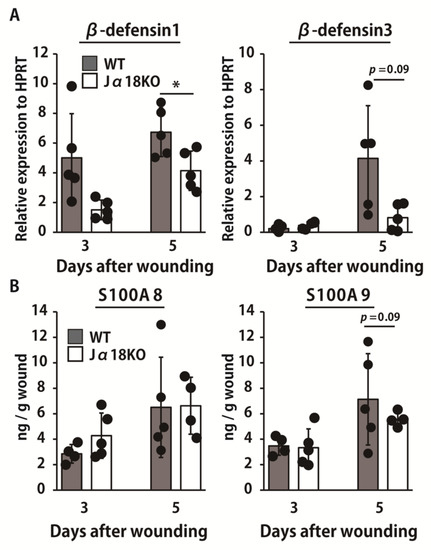 AMPs are known to control bacterial growth as an innate immune system. Therefore, we examined the production of AMPs, such as β-defensin1, β-defensin3, S100A8, and S100A9. As shown in Figure 3A, the expression of β-defensin1 was significantly lower in Jα18KO mice than it was in WT mice on day 5. β-defensin3 expression was decreased in Jα18KO mice compared with that in WT mice, although this difference was not statistically significant. In addition, there was no significant difference in the production of S100A8 and S100A9 between the two groups on days 3 and 5 (Figure 3B).