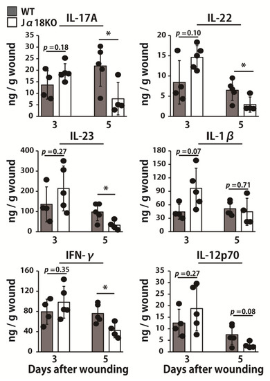 Effect of iNKT cell deficiency on the production of cytokines at the wound sites after inoculation with P. aeruginosa. WT and Jα18KO mice were wounded and inoculated with P. aeruginosa. IL-17A, IL-22, IL-23, IL-1β, IFN-γ, and IL-12p70 levels in the wounded tissues were measured on days 3 and 5 (n = 4–5). Black circles represent one individual mouse. Each column represents the means ± SD. The results are representative of at least two independent experiments. * p < 0.05.