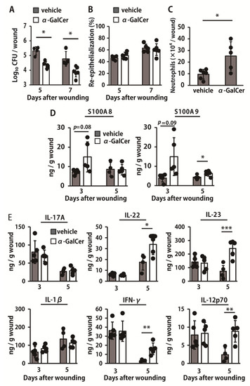 To further address the possible contribution of iNKT cells, we examined the effects of administration of α-GalCer, a specific activator of these cells, on the clearance of P. aeruginosa. α-GalCer treatment significantly reduced the number of live bacteria in the wounds on days 5 and 7, when compared to the vehicle treatment (Figure 5A). However, the ratio of re-epithelialization was not significantly different between the two groups (Figure 5B). The number of neutrophils was significantly higher in α-GalCer-treated mice than that in vehicle-treated mice on day 3 (Figure 5C). As shown in Figure 5D, S100A9 production in α-GalCer-treated mice was significantly increased compared to that in vehicle-treated mice on day 5 whereas S100A8 and S100A9 production tended to be increased in α-GalCer-treated mice compared to that in vehicle-treated mice on day 3. In addition, α-GalCer-treated mice exhibited increased production of IL-22, IL-23, IFN-γ, and IL-12p70 compared with that of vehicle-treated mice on day 5 (Figure 5E).
