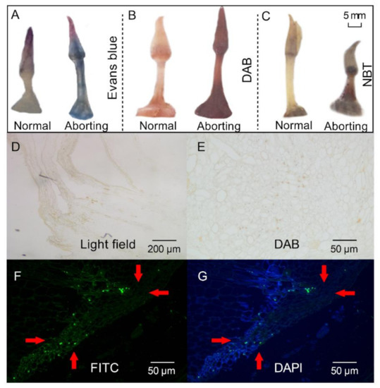 Histochemical staining and TdT-mediated dUTP-biotin nick end labeling (TUNEL) staining of lotus flower buds. After growing for 2 months, 2- to 3-cm-long flower buds were excised for different staining. (A–C) Evans blue (A), 3, 3-diaminobenzidine (DAB) (B), and nitro blue tetrazolium chloride (NBT; (C)), staining of the normal and aborting flower buds. Bar, 5 mm; (D) Bright field view. (E–G) TUNEL analysis of the aborting flower buds stained with DAB (E), fluorescein isothiocyanate (FITC; (F)), and 6-diamidino-2-phenylindole (DAPI; (G)). The red arrows with the same direction point to the same position on the bud.