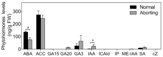 Endogenous hormone proles of normal and aborting flower buds. After growing for 2 months, 2- to 3-m long normal or aborting flower buds were excised for phytohormone or biosynthetic intermediates content analysis. Content of abscisic acid (ABA), 1-Aminocyclopropanecarboxylic acid (ACC), salicylic acid (SA), gibberellin A15 (GA15), GA20, GA3, auxin, indole-3-acetic acid (IAA), methyl indole-3-acetate (ME-IAA), Indole-3-carboxaldehyde (ICAld), N6-isopentenyladenine (IP), and cis-zeatin (cZ) were analyzed. Values are the means ± SE of three independent experiments with at least three replicates for each. Bars with asterisks were significantly different in comparison with normal buds at * p < 0.05, according to the t-test.