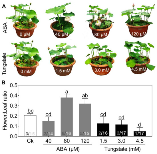 To test this hypothesis, exogenous ABA, ranging from 40 to 120 μM, and its inhibitor, tungstate, ranging from 1.5 to 4.5 mM, were added (Figure 4). Seedlings treated with increasing concentrations of ABA exhibited a differential alleviating effect on flower bud abortion, with a maximal response at 80 μM (Figure 4). By contrast, the inhibitor exerted the opposite effect on flower:leaf ratio (Figure 4). The promoting effects of exogenous ABA on flowering have also been reported in several other plant species [5]. These results demonstrated that ABA might play a significant role in regulating lotus flower bud abortion. However, compared with the extensive studies of ABA in plant stress responses, its role in the flowering regulatory network is just beginning to emerge.