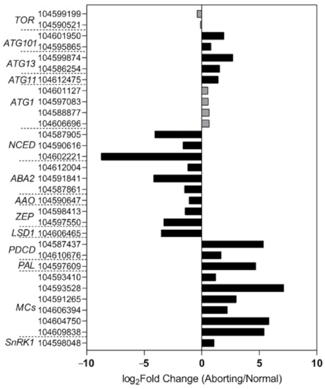 To gain a better understanding of the regulatory mechanisms in lotus flower bud abortions, we performed RNA-seq analysis of the normal and aborting flower buds. The transcriptomic data showed that key genes involved in the biosynthesis pathway of ABA changed in accordance with the levels of ABA (Figure 5), including 9-cis-epoxycarotenoid dioxygenase (NCED), xanthoxin dehydrogenase (ABA2), abscisic-aldehyde oxidase (AAO), and zeaxanthin epoxidase [18,19,20]. These results demonstrated that the decrease in ABA content was caused by decreased biosynthesis. Moreover, the expression of genes related to PCD regulation showed significant changes between the normal and aborting buds (Figure 5). Well-known positive regulators, like programmed cell death protein 4 (PDCD4), PDCD5, phenylalanine ammonia-lyase (PAL), and metacaspase (MCs), and negative regulators, such as lesion simulating disease 1 (LSD1) [17,21], changed significantly in the aborting flower buds (Figure 5).