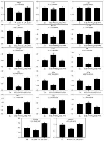 Expression analysis of autophagy- and programmed cell death (PCD)-related genes in the lotus. Two-month-old lotus seedlings were used for infection with IL-60-BS-derived systems. IR-NnSnRK1-RI, NnSnRK1-silenced lotus; pIR-NnSnRK1, NnSnRK1-overexpressed lotus. After 14 days of infection, the gene expression level was analyzed using quantitative real-time reverse transcriptase-polymerase chain reaction (qRT-PCR). Values are the means ± SE of three independent experiments with at least three replicates for each. Bars marked with different letters are significantly different from each other at p < 0.05, according to Tukey’s multiple test.