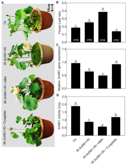 We then further analyzed the relationship between NnSnRK1 and ABA. When seedlings were treated with ABA, the expression level (Figure 8A) and protein kinase activity (Figure 8B) of NnSnRK1 significantly decreased. The result was consistent with previous work in wheat and rice, which showed that ABA treatment can result in a drastic decline in SnRK1 [9,33]. The phenotype of NnSnRK1-silenced seedlings could also be enhanced by ABA treatment (Figure 9), with its flower:leaf ratio increased by 52%. Tungstate treatment caused the flower:leaf ratio of NnSnRK1-silenced seedlings to return to the ratio similar to the control (Figure 9). This might be explained by their activating or repressing effects on the expression level and activity (Figure 9) of NnSnRK1. In plant vegetative growth and stress response, however, ABA was reported as an activator of SnRK1 through inhibition of type 2C protein phosphatases [34,35]. Here, we revealed an additional unknown regulatory pathway of ABA/SnRK1 in controlling flower bud abortion, finding that NnSnRK1 is a negative flowering regulator in the ABA-mediated signaling pathway of flowering time control. We concluded that SnRK1 might act as an important developmental switch between vegetative/stress responses and reproductive development. It needs to be noted that NnSnRK1 is necessary, but might not be sufficient, for inducing lotus flower bud abortion, indicating that other components in this pathway remain to be identified. The above signaling pathway could help the lotus to terminate the flowering processes with low reproductive success, thereby ensuring that resources are optimally used and redirected in support of survival.