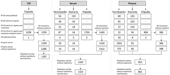Exosomal proteomes obtained for the distinct biofluids. Steps implemented to obtain the final proteomes using the three databases (Vesiclepedia, ExoCarta, EVpedia) for cerebrospinal fluid (CSF), serum and plasma. A set of exclusion filters was used in this order: number of entries for the biofluid, number of ID entries for Homo sapiens, number of ID entries for H. sapiens and exosomes, number ID entries for H. sapiens and exosomal gene names, number of corresponding PubMed articles, number of gene names and number of gene names without repetitions. Subsequently, the lists obtained for the three databases were overlapped, the repetitions deleted and, the gene names corresponding to the exosomal proteins identified in the literature for CSF, serum or plasma were included in the final lists. The EVpedia’s obtained Uniprot IDs were converted to gene names. In the case of CSF, only EVpedia had information available. * One study was excluded since it was related to urine exosomal proteome and not to serum.