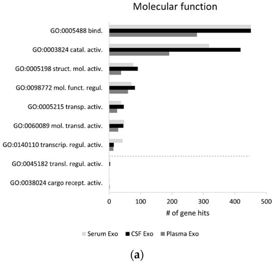 The characterization and comparison of the exosomal proteomes is relevant since it can give important clues into the main processes and pathways to which the distinct biofluid proteomes are most associated, allowing one to potentially explore new disease biomarker candidates. GO enrichment analysis was thus performed, at the level of the molecular function and biological process; and the major pathways linked to these proteomes were addressed. A global GO analysis for these biofluids’ exosomal proteomes was carried out using the Panther classification system online tool (Figure 2). At the molecular function level, the top five functions identified were the same for all exosomal proteomes and included “binding”, “catalytic activity”, “structural molecule activity”, “molecular function regulator” and “transporter activity” (Figure 2a).