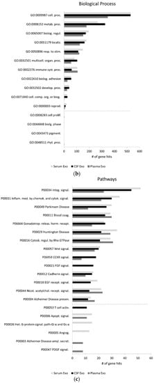GO analysis of the shared exosomal proteome. Shared exosomal proteome associated molecular functions (a), biological processes (b) and pathways (c). GO analysis was performed for gene lists corresponding to the exosomal proteomes from serum, plasma and CSF, through the Panther classification system. Abbreviations of molecular function GOs terms: GO:0005488 binding; GO:0003824 catalytic activity; GO:0098772 molecular function regulator; GO:0005198 structural molecule activity; GO:0060089 molecular transducer activity; GO:0005215 transporter activity; GO:0140110 transcription regulator activity. Abbreviations of biological process GOs terms: GO:0009987 cellular process; GO:0008152 metabolic process; GO:0050896 response to stimulus; GO:0002376 immune system process; GO:0065007 biological regulation; GO:0051179 localization; GO:0032501 multicellular organismal process; GO:0022610 biological adhesion; GO:0032502 developmental process; GO:0000003 reproduction. Abbreviations of pathways GOs terms: P00011 blood coagulation; P00016 cytoskeletal regulation by Rho GTPase; P00034 integrin signaling pathway; P00029 Huntington disease; P00049 Parkinson disease; P00050 plasminogen activating cascade; P00044 nicotinic acetylcholine receptor signaling pathway; P00031 inflammation mediated by chemokine and cytokine signaling pathway; P00024 glycolysis; P00006 apoptosis signaling pathway; P06664 gonadotropin-releasing hormone receptor pathway; P06959 Cholecystokinin receptor (CCKR) signaling map; P00004 Alzheimer’s disease-presenilin pathway; P00057 Wnt signaling pathway; P00005 angiogenesis.
