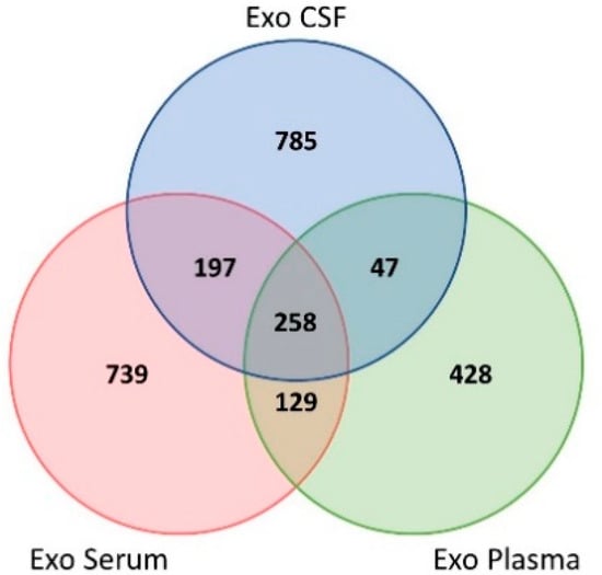 To address the shared biofluids’ proteome, the protein lists were compared by means of a Venn diagram (Figure 3). A total of 258 proteins were identified in exosomes from all three biofluids (CSF, plasma, serum). In addition, 197 proteins were shared by both CSF and serum, whereas 47 proteins were shared by both CSF and plasma.