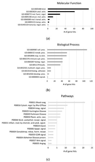 All proteomes were analyzed using the Panther classification system (http://www.pantherdb.org/), version 14. Gene ontology (GO) enrichment analysis at the molecular function, biological process was carried out on the 22 January 2020. The biofluids proteomes’ main pathways were likewise identified.