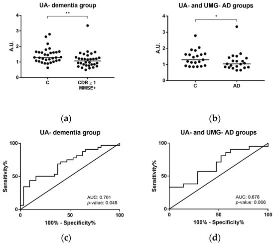 Gelsolin concentrations in dementia and AD cases determined by ELISA. Gelsolin levels were assessed through ELISA assays in serum-derived exosomes from controls (CDR = 0 and MMSE–) and individuals with dementia (CDR ≥ 1 and MMSE+) from UA-dementia group (a), and from AD clinically diagnosed cases and controls from UA- and UMG-groups (b). ROC curves were obtained for the control and dementia group (UA-dementia group) (c) and controls and AD cases from UA- and UMG-groups (d). Each point represents the gelsolin mean concentration obtained for each individual and the solid horizontal line shows median of the groups. Abbreviations: AD, Alzheimer’s disease; A.U., arbitrary units; AUC, area under the curve; C, controls; CDR, clinical dementia rating; ELISA, enzyme-linked immunosorbent assay, MMSE, Mini-Mental State Examination; ROC, receiver operating curve. ** p ≤ 0.01.