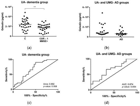 Further, results obtained by Western blot analysis were validated by a complementary approach, using an enzyme-linked immunosorbent assay (ELISA)-based assay for detection of human GSN levels. Consistently, a significant decrease in the median levels of GSN was likewise observed for serum-derived exosomes in the dementia group (CDR ≥ 1 and MMSE+) when compared with controls (CDR = 0 and MMSE+) (p-value = 0.008) (Figure 6a). In the case of controls and ADs from both UA- and UMG-groups, the same pattern of decrease was exhibited for AD cases, although without significant differences (p-value = 0.055) (Figure 6b). ROC curves were calculated and the AUC obtained was again approximately 0.7 when comparing controls and CDR ≥ 1 and MMSE+ individuals from the UA-dementia group (Figure 6c); and controls and AD cases from UA- and UMG-groups (Figure 6d).