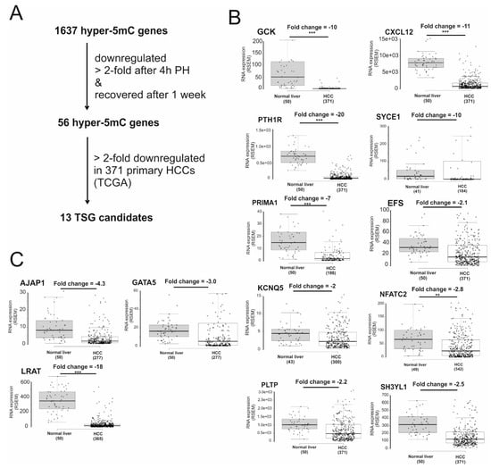 Identification of tumor suppressor gene (TSG) candidates. (A) Strategy to identify potential TSGs: gene expression of 1637 hypermethylated genes before and four hours (4 h) after partial hepatectomy (PH) was examined using previously published RNA-Seq data (GSE95135). To narrow TSG candidates further, the expression of 56 genes downregulated after PH in 371 primary HCCs was examined. (B,C) Boxplot showing gene expression of 13 TSG candidates in normal liver versus primary HCC: mRNA expression generated by the Cancer Genome Atlas (TCGA) and fold change (normal liver versus HCC) were retrieved from Firebrowse (http://firebrowse.org/, accessed on 3 February 2021) data portal. **: p-value < 0.0001; *** p-value < 0.0000001. RSEM: RNA-Seq by expectation–maximization [].