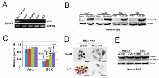 Overexpression of GCK inhibited cell proliferation. (A) Total RNAs from normal human liver (Origene), Huh7, HepG2, C3A, and HLF cells were used to examine the expression of GCK. glyceraldehyde-3 phosphate dehydrogenase (GAPDH) was used as the loading control. (B) Control vector (Vector) and FLAG-tagged GCK (FLAG–GCK) were overexpressed in Huh7, HepG2, C3A, and HLF cells. Two days after transfection, total cell lysates were applied for FLAG and actin-specific immunoblot. Actin was used as the loading control. (C) Sister cultures of (B) were subjected to crystal violet assay. Numbers are mean ± SD. ***: p-value < 0.001, *: p-value < 0.05. (D) HepG2 and C3A cells were transfected with the control vector and FLAG–GCK. Two days after transfection, cells were fixed in ice-cold methanol and stained with Ki67 specific antibody by IHC (immunohistochemistry) technique. Representative images were shown. Bars represent 50 µm. (E) Sister culture of (D) was subjected to PARP and actin-specific immunoblotting. Actin was used as the loading control.