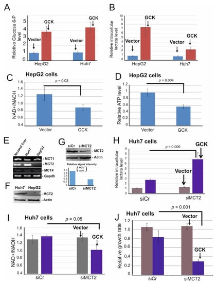 GCK overexpression caused intracellular lactate accumulation and induced energy crisis due to NAD+ depletion. (A,B) Huh7 and HepG2 cells were transfected with a control vector (Vector) and FLAG-tagged GCK. Two days after transfection cells were homogenized and deproteinized. Deproteinized lysates were then supplied for glucose-6-phosphate assay (A) or lactate assay (B). (C,D) HepG2 cells were transfected with a control vector (Vector) and FLAG-tagged GCK. Huh7 and HepG2 cells were used to examine the expression of MCT1-4. GAPDH was used as the loading control. (F) Cell lysates of Huh7 and HepG2 cells were applied for MCT2 specific immunoblot. Actin was used as the loading control. (G) Huh7 cells were transfected with siRNA control (siCr) and siMCT2. Three days after transfection cells were lysed and subjected to MCT2 and actin-specific immunoblotting. Immunoblot signal was quantified using ImageQuant. (H,I) Huh7 cells were transfected with control siRNA (siCr) and siMCT2. After 24 hours, cells were transfected with vector control and FLAG–GCK and further cultured for two days. Cells were then supplied for lactate- (H) and NAD+/NADH assay (I) as described above. (J) Sister cultures of (J) were subjected to crystal violet assay. Numbers are mean ± SD. p: p-value.