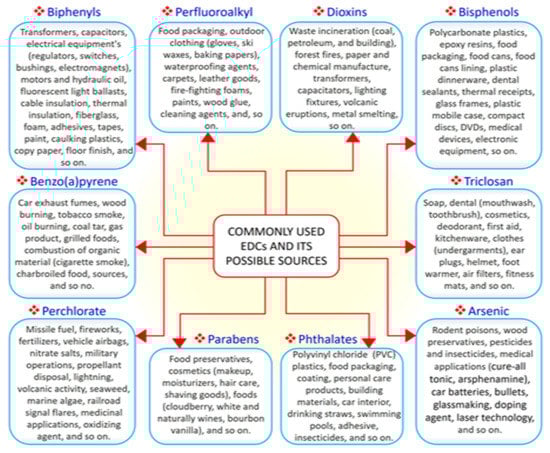 EDCs are natural or synthetic compounds that can act as hormones by manipulating and compromising several mechanisms of the endocrine system to produce serious effect on the overall health of both humans and animals [,,]. EDCs such as bisphenols (e.g., bisphenol A, BPA) and phthalates are essential chemicals used as raw materials in plastic industries []. Other groups of EDCs include dioxins, perchlorate, perfluoroalkyl, and polyfluoroalkyl substances, phytoestrogens, polybrominated diphenyl ethers (PBDE), polychlorinated biphenyls (PCB), and triclosan, which constitute components of many consumer and household products, including foods, resulting in widespread human exposure [,]. A search of the literature demonstrated that the vast majority of EDCs are widely and increasingly being used worldwide. Derivatives of BPA (bisphenol S, bisphenol F, and bisphenol E) are used in the production of polycarbonate plastics, epoxy resins, food packaging, dental sealants, and thermal receipts [,,]. High-molecular-weight phthalates such as di (2-ethylhexyl) phthalate (DEHP), di-isononyl phthalate di-isodecyl phthalate, and benzylbutyl phthalate are used in making polyvinyl chloride (PVC) plastics, medical devices, pharmaceutical coatings, food packaging, car interiors, drinking straws, and adhesives []. Low-molecular-weight phthalates such as diethyl phthalate, di-n-butyl phthalate, and di-iso-butyl phthalate are used in making perfumes, deodorants, nail polish, and insecticides []. PBDE, perchlorate, triclosan, and polychlorinated biphenyls are used in making furniture foam, fireworks, liquid body wash, and hydraulic fluids, respectively []. As the most common EDCs, BPA and phthalates can be ingested along with food and beverages packaged in containers containing them. The ubiquitous distribution of EDCs makes it possible for humans to be exposed to EDCs via the transdermal, oral, inhalation, and parenteral routes [,]. A summary of commonly used EDCs and their exposure sources is compiled in Figure 1.