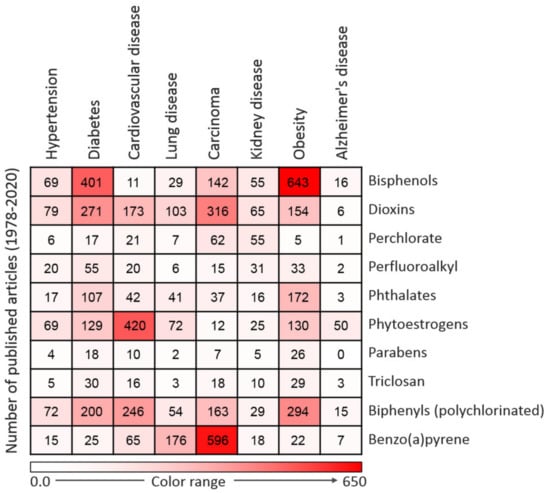 Heatmap representing the number of articles published on the 10 commonly used endocrine-disrupting chemicals (EDCs) in association with particular diseases. Data were collected by a thorough search of the Web of Science database. Only peer-reviewed papers published in English from 1978 to 2020 on specific EDCs and diseases were included.