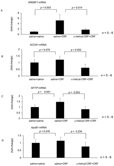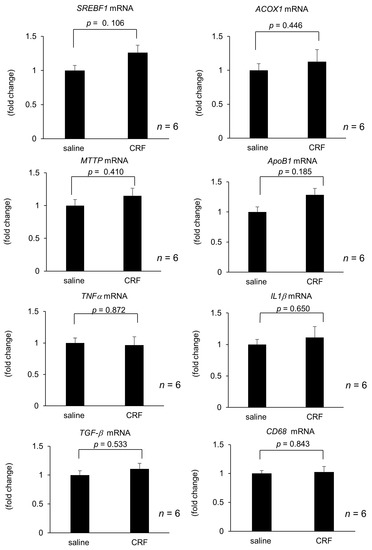 Hepatic SREBF1, ACOX1, MTTP, ApoB, TNFα, IL1β, TGFβ, and CD68 mRNA levels were unaltered 6 h after intravenous CRF injection when compared with those observed following saline administration (Figure 3).