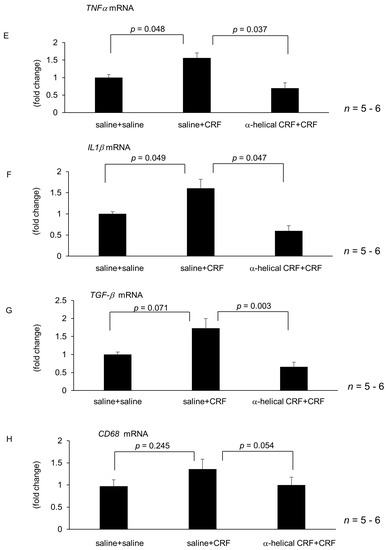 Effect of intracisternal injection of α-helical CRF on CRF-induced modulation of hepatic gene expression 6 h after intracisternal CRF administration. The number of each group in rats was six. Hepatic lipid metabolism and inflammation-related gene expression 6 h after intracisternal CRF administration. Relative mRNA expressions of SREBF1 (A), ACOX1 (B), MTTP (C), ApoB1 (D), TNFα (E), IL1β (F), TGFβ (G), and CD68 (H) were evaluated and compared with respective saline control. Statistical analysis was performed using ANOVA, and data are expressed as means ± standard error (SE).