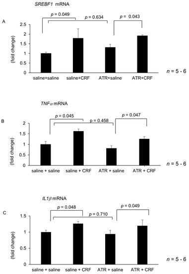 We showed that SREBP1 mRNA levels when saline was injected prior to CRF was larger than those in the first experiments. The exact reason why this phenomenon occurred remains to be elucidated. Saline injection that was administered before CRF might boost the effect of CRF.