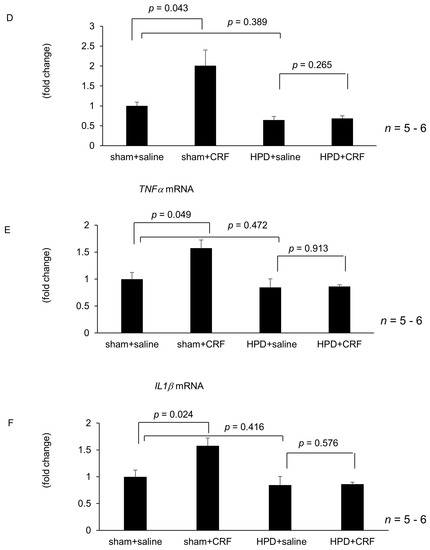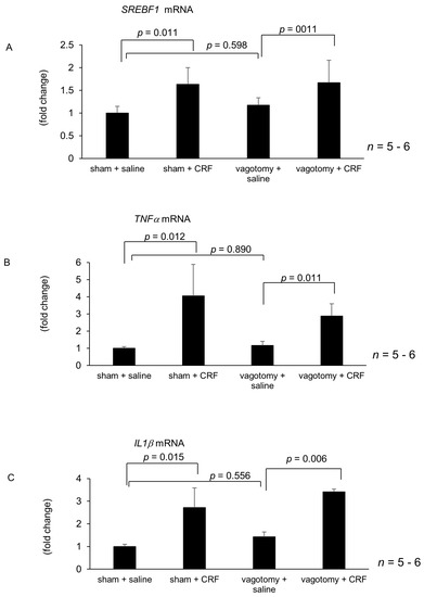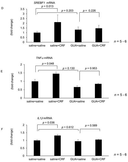 2.1. Effect of Intracisternal CRF Injection on Hepatic Lipid Metabolism and Inflammation-Related Gene Expression