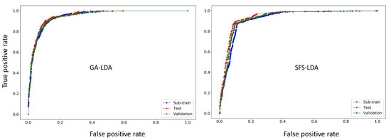 Another way of confirming the classification ability of any LDA model is by means of the receiver operating characteristics (ROC) curve [43]. Figure 2 shows the ROC plots for the GA-LDA and SFS-LDA models. One can see that both these models are not random, but truly statistically significant classifiers, since the area under the ROC curves (ROC AUC scores calculated with Scikit-learn [44]) for all the sets are statistically higher (>0.88) than that of a random classifier model (ROC AUC score = 0.5).