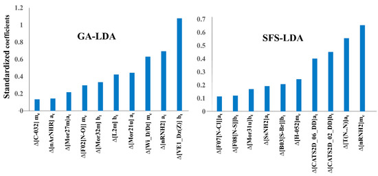 Undeniably, one of the primary advantages of linear models is the possibility of identifying the most crucial structural and physicochemical factors responsible for the higher activity of the compounds [46]. A description of all the descriptors appearing in the three linear models is given in Table 4. However, considering the higher statistical quality of both the GA-LDA and SFS-LDA models, our discussion will focus mainly on the descriptors appearing in these models. Since the relative contributions of the descriptors can only be understood by analyzing the absolute values of their standardized coefficients, these are shown in Figure 3 for the GA-LDA and SFS-LDA models.