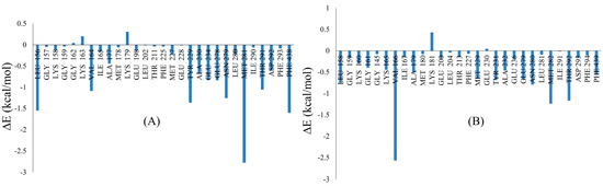 These MD simulations were carried out with docked (Autodock-based) complexes of these compounds for 50 ns. The docked complexes of some selected virtual hits (i.e., the starting ligand-protein complexes used in the MD simulations) are provided in the Supplementary Materials. The root-mean-square-deviation (RMSD) plots of the backbone atoms of the receptor-ligand complexes, ligand RMSD plots, the root-mean-square-fluctuation (RMSF) plots of these protein structures, and the radius of gyration’ plots are presented in the Supplementary Materials (Figures S4–S6). A close look at these plots reveals an adequate dynamic stability as well as compactness of the ligand-macromolecule complexes. However, our major goal was to estimate the binding free energies of these ligand-protein complexes, which was computed by the molecular mechanics-generalized Born surface area (MM-GBSA) approach.