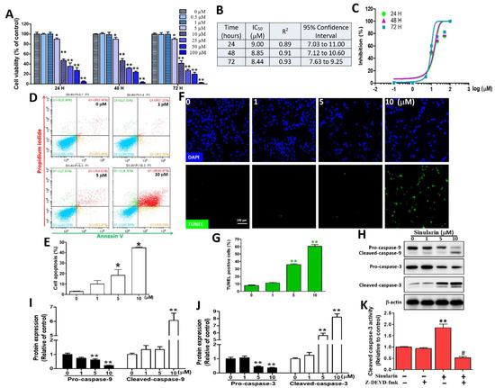 To understand cell viability under sinularin treatments, a range of concentrations (0, 0.5, 1, 5, 10, 25, 50, or 100 μM) was evaluated in SK-HEP-1 cells using the MTT (3-(4,5-dimethylthiazol-2-yl)-2,5-diphenyltetrazolium bromide) assay. After 24 h of incubation, the percentage of cell viability under 0, 0.5, 1, 5, 10, 25, 50, and 100 μM of sinularin was 100.00 ± 9.02, 99.90 ± 1.70, 100.00 ± 3.12, 90.15 ± 2.07, 46.89 ± 2.91, 35.36 ± 6.99, 26.96 ± 6.07 and 4.25 ± 1.67%, respectively. We also evaluated the same sinularin concentrations for 48 and 72 h. The half-maximal inhibitory concentration (IC50) of sinularin was determined to be ~9.0, 8.8, and 8.5 μM after 24, 48, and 72 h, respectively (Figure 1A–C). Therefore, we applied 10 μM (~IC50 value) or a lower range of 0–10 μM to study the effect of sinularin. To assess the mode of cell death induced by sinularin, Annexin V and PI-stained cells were subjected to flow cytometric analyses. It was reported that Annexin V+/PI− indicated an early apoptotic cell population (the lower right quadrant), while Annexin V+/PI+ indicated a late apoptotic cell population (the upper right quadrant) [13]. Figure 1D shows the typical transfer of apoptotic cells (early and late) from the left quadrant to the right quadrant in SK-Hep-1 cells treated with 0, 1, 5, and 10 μM of sinularin for 24 h. The findings showed that the numbers of apoptotic cells were significantly increased to 18.43 ± 5.42% and 44.74 ± 0.72% at 5 and 10 μM of sinularin, relative to the control (2.98 ± 0.41%, 0 μM of sinularin, Figure 1E). At a magnification of 200X, the TUNEL assay and immunofluorescence staining of the SK-HEP-1 cells after treatment with 0, 1, 5, and 10 μM of sinularin showed DNA fragmentation (upper, green fluorescence). All nuclei (lower, blue fluorescence) were stained with DAPI (4′,6-diamidino-2- phenylindole) (Figure 1F). The results showed that TUNEL-positive cells induced the DNA fragmentation of SK-HEP-1 cells in a concentration-dependent manner under 5 and 10 μM of sinularin, which significantly increased to 35.72 ± 1.08% and 60.39 ± 2.15%, relative to the control (7.91 ± 0.46%, 0 μM sinularin, Figure 1G). Subsequently, Western blot analyses were carried out to understand the expression profiles of pro-caspases-3/9 and cleaved-caspases-3/9, with all proteins normalized with β-actin (Figure 1H). Sinularin treatment between 0–10 μM decreased the amount of pro-caspases-9 (an approximate 80% decrement) and pro-caspases-3 (an approximate 65% decrement), which was followed by a significant increase of the cleaved-caspase-9 form (about a 6.1-fold increment) and the cleaved-caspase-3 form (about an 8-fold increment), leading to apoptosis (Figure 1I,J). Following pre-treatment with and without 10 μM of a caspase-3 inhibitor (Z-DEVD-fmk), the caspase-3 activity was significantly reversed compared to sinularin alone (Figure 1K). In addition to evaluating cell viability using SK-HEP-1 cells, we determined the IC50 values in another HCC cell line (Huh-7) and in a normal mouse liver cell line (Clone 9), at ~20 and >100 μM, respectively, following sinularin treatments for 24, 48, and 72 h (Supplementary Figure S1). Taken together, the IC50 of the sinularin for normal liver cancer cells was more than 5-fold the dosage of the HCC cells, while the results of the cell viability, annexin-V/PI staining, TUNEL immunofluorescence, and Western bottling showed that sinularin treatment could significantly enhance the apoptosis of SK-HEP-1 cells.