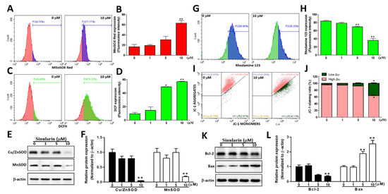 Sinularin induced the mitochondrial O2– and intracellular ROS production, the loss of mitochondrial membrane potential, and expression of relevant proteins in SK-HEP-1 cells. (A) The fluorescence intensity of mitochondrial O2–, measured using MitoSOXTM Red under 0 or 10 µM of sinularin for 24 h. (B) Quantification of O2– accumulation in the mitochondria through analyzing the gated range of single-parameter histograms from 5 × 103–106. (C) The fluorescence intensity of intracellular ROS, measured using CM-H2DCFDA under 0 or 10 µM of sinularin for 24 h. (D) Quantification of DCF (2′,7′-dichlorofluorescein) signals from the intracellular ROS level via analyzing the gated range of single-parameter histograms from 5 × 103–106. (E) SK-HEP-1 cells treated with different concentrations of sinularin for 24 h. The cell lysates were subjected to Western blot analysis of the bands of Cu/ZnSOD, MnSOD, and the internal control β-actin. Full, uncropped Western blot gels are shown in Supplementary Figure S2B. (F) Cu/ZnSOD and MnSOD protein levels, quantified by densitometry analysis using ImageJ software after being normalized with the β-actin level. (G) SK-HEP-1 cells treated with and without 10 μM of sinularin for 24 h. ΔΨ depolarization effects were detected using cell-permeable cationic Rhodamine 123 and flow cytometry. (H) Quantification of Rhodamine 123 signals. The quantitative values were obtained after analyzing the gated range of single-parameter histograms from 2 × 106–107. (I) SK-HEP-1 cells were treated with and without 10 μM of sinularin for 24 h. ΔΨ depolarization effects were detected using cell-permeable cationic JC-1 and flow cytometry, and mitochondrial depolarization was indicated by a decrease in the red fluorescence signal. (J) Quantification of JC-1 signals. The quantitative values were obtained after analyzing the gated range of the quadrant plot from high ΔΨ (upper right) and low ΔΨ (lower right). (K) Western blot analysis with antibodies against Bcl-2, Bax, and the internal control β-actin. Full, uncropped Western blot gels are shown in Supplementary Figure S2C. (L) Bcl-2 and Bax protein levels, quantified by densitometry analysis using ImageJ software after being normalized with the β-actin level. Each bar represents the mean ± SE of three independent experiments. The results were analyzed using Student’s t-test to determine the significance, in which * p < 0.05 and ** p < 0.01 relative to the control (sinularin-untreated cells).